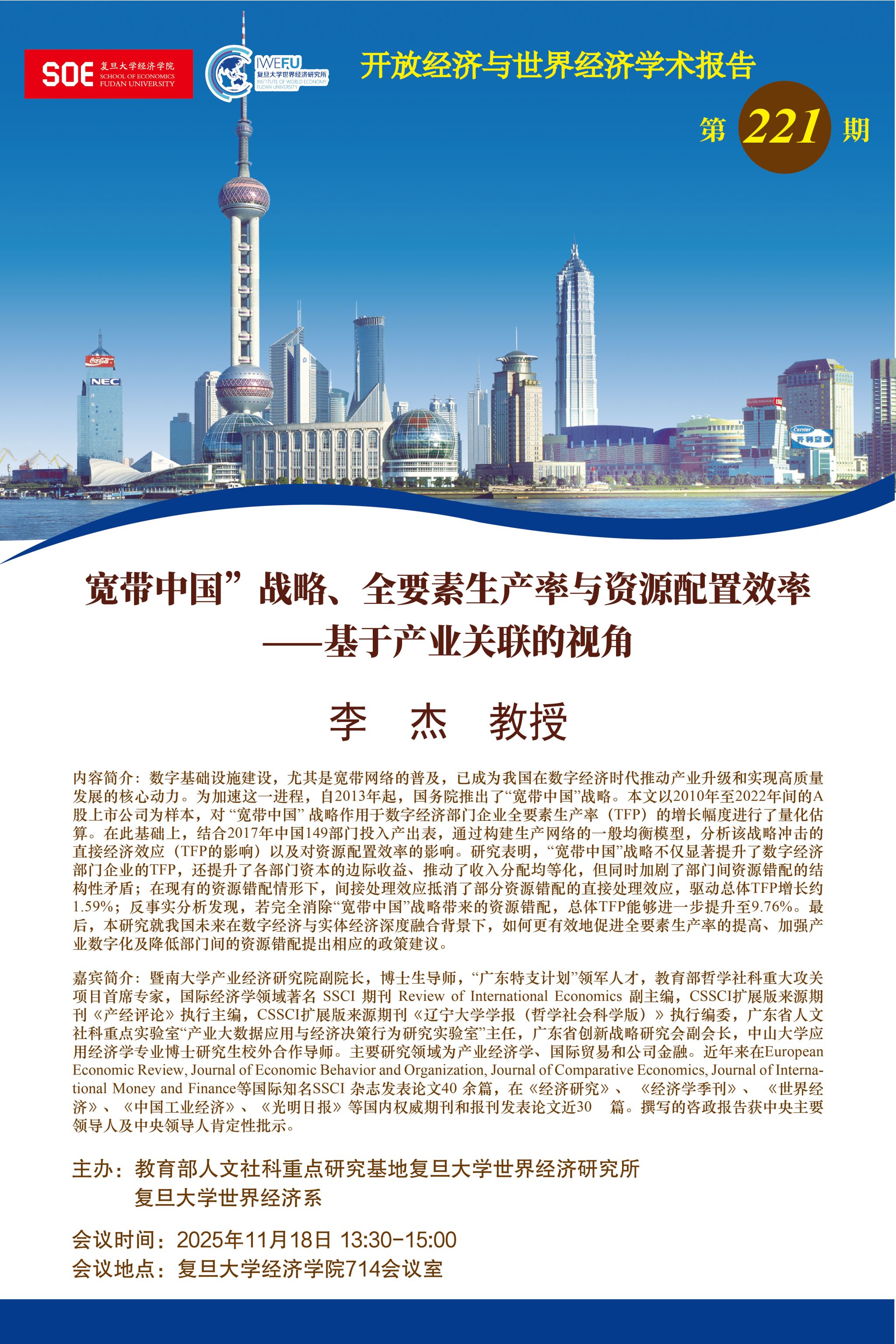 【讲座预告】复旦大学世界经济研究所开放经济与世界经济学术报告第221期:宽带中国”战略、全要素生产率与资源配置效率——基于产业关联的视角