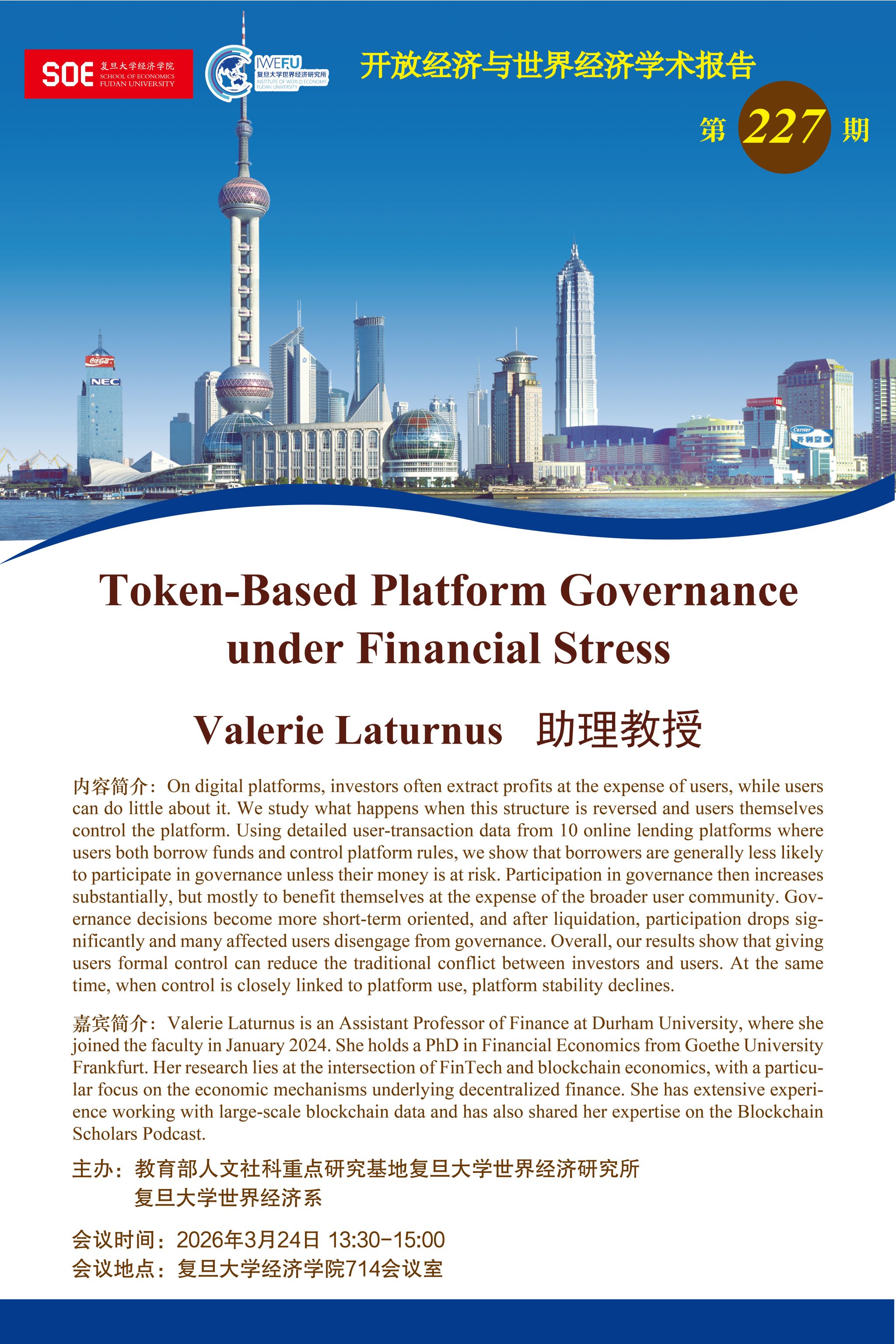 【讲座预告】复旦大学世界经济研究所开放经济与世界经济学术报告第227期:Token-Based Platform Governance under Financial Stress